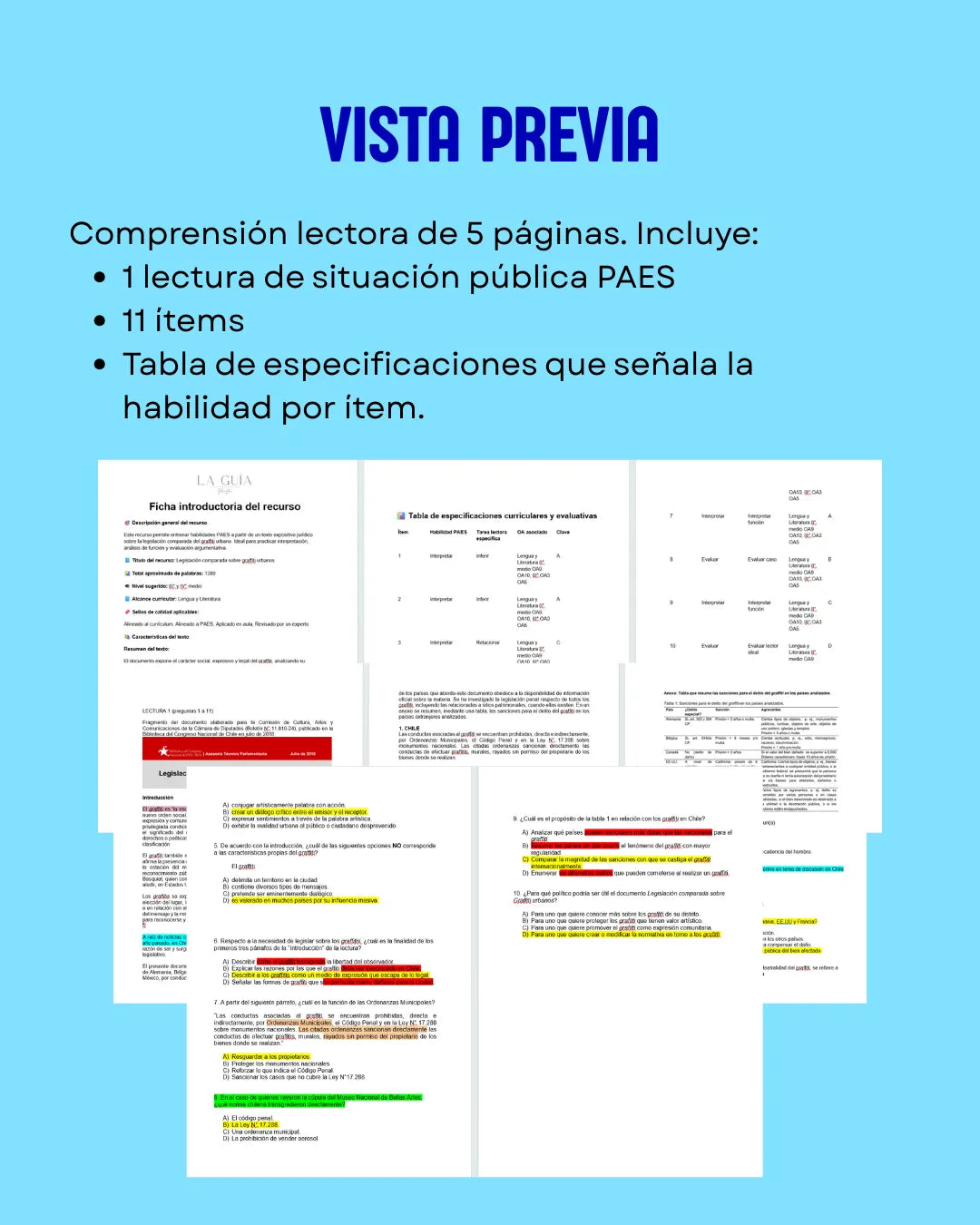 Este recurso pone en tus manos un documento oficial sobre la legislación comparada del graffiti urbano, ideal para trabajar en profundidad con estudiantes de III° y IV° medio. A través de 11 ítems de alta calidad, tus alumnos podrán ejercitar las habilidades clave de la PAES de Competencia Lectora: inferir, interpretar funciones, evaluar argumentos y comprender propósitos normativos.