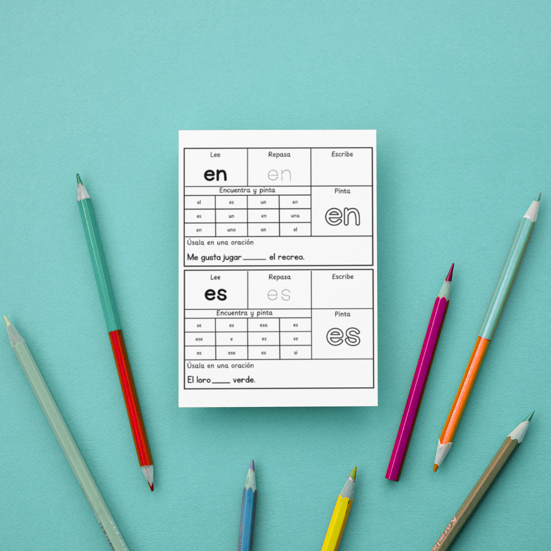 - En clase: presenta 2–4 palabras por semana con los afiches; practica con el cuadernillo (Lee–Repasa–Escribe; Encuentra y pinta; Usa la palabra en una oración).